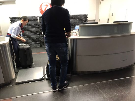 機内には持ち込まない自転車や、大きな荷物を窓口にて、重量の計測など、預ける手続きをおこないます。